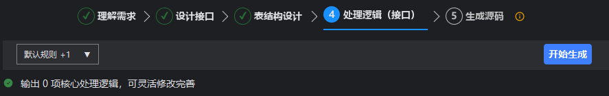 您可以自定义处理逻辑规则,比如将每个接口拆分为一或多个个任务,或者详细描述每个任务的具体内容等,您都可以在新增规则中定义描述,然后在开始生成时,选择您定义的规则即可。如果不自定义规则,则系统使用默认规则生成处理逻辑的内容。