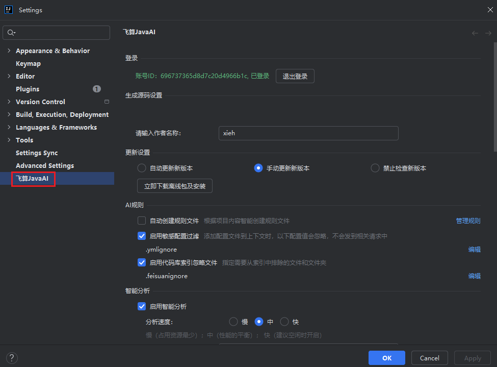 打开IDEA左上角 “File > Settings” , 然后单击“飞算JavaAI”,进入高级设置页面。