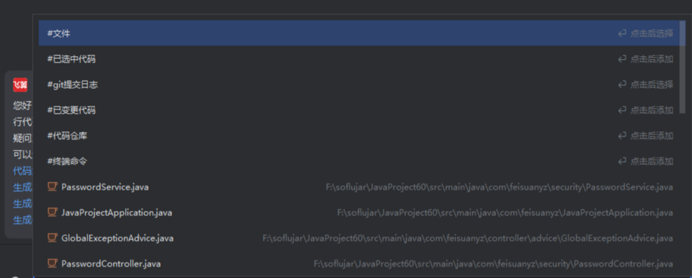 | 已选中代码 | 编辑器框选的文件内容 | 添加异常处理/性能优化 |