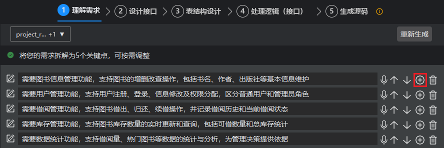 系统已根据您提供的需求描述,自动拆分出多个功能点。您可以检查这些功能点是否齐全和准确,若发现有缺失的功能点,可通过手动添加一行数据的方式进行补充,并详细描述该需求功能点。