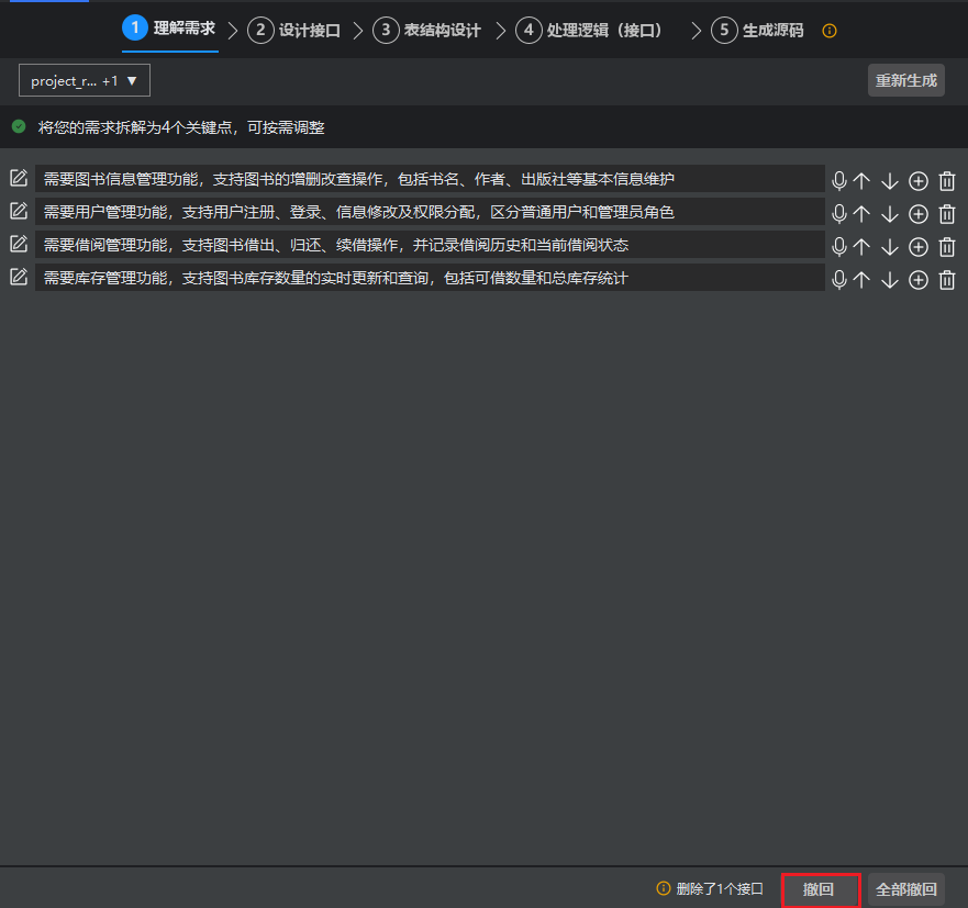 系统已根据您提供的需求描述,自动拆分出多个功能点。您可以检查这些功能点是否齐全和准确。如果在操作过程中误删了任何需求,可以通过撤回功能恢复到之前的修改状态;若选择全部撤回,则可以回到最初始的状态。