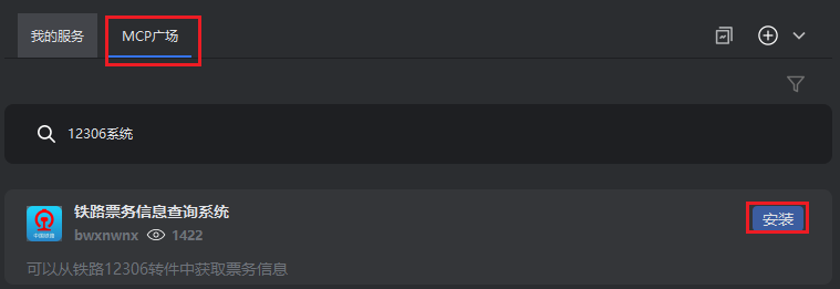 - 单击“MCP广场”,然后搜索框可输入对应MCP服务,搜索,然后在搜索结果中,单击“安装”。如推荐中有您需要的服务,也可以直接单击“安装”。