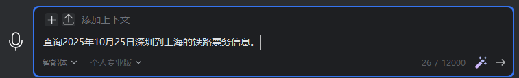 - 在智能体会话模式下,输入需求:查询2025年10月25日深圳到上海的铁路票务信息。
