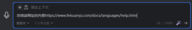 - 在智能体会话模式下,输入需求:总结该网址的内容https://www.feisuanyz.com/docs/languages/help.html