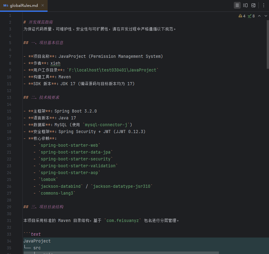 全局规则,所有项目都会生效。您可以在“全局规则”列表下创建对应的规则。设定项目级的通用规范,如编码风格、偏好格式、默认的回答角色等。