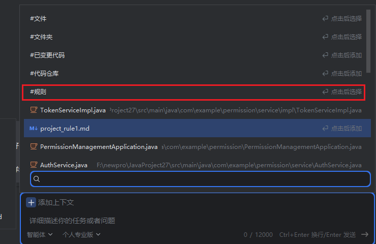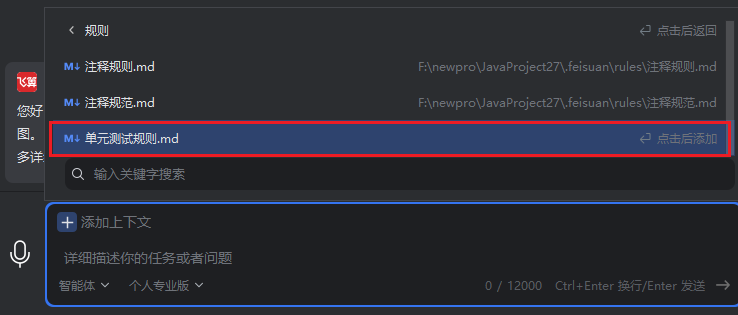 - 在智能会话描述区,单击“关联上下文”或者输入“#”,选择“规则”,然后选择手动引入的规则文件。