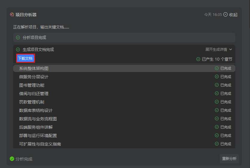 说明:单击下载文档时,章节状态为等待中的文档并未生成,请等待所有章节完成后再下载,如果某个章节生成失败,可单击该章节进行重试,重新生成。文档为Markdowm格式,内容是基于项目源码及相关配置进行分析后进行总结和整理而生成的。如果深度模式开启后,生成的内容则会更精确和丰富,可在章节中查看生成的进度。