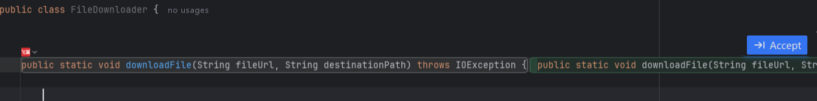 Review the predicted content. Hover your mouse over the Accept button to choose to accept or reject the suggestion. Once accepted, the code is updated accordingly.
