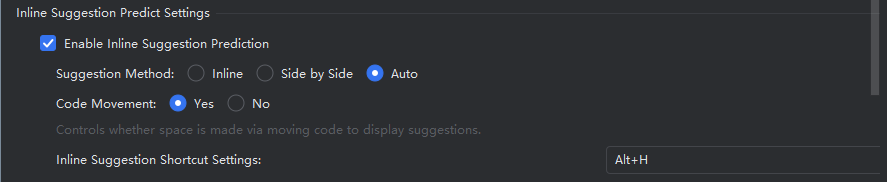 In Advanced Settings, check "Inline Suggestion Prediction". Once enabled, you can configure the recommendation display mode and set a shortcut key to trigger inline suggestion prediction. Later, you can simply use the shortcut wherever you need this feature.