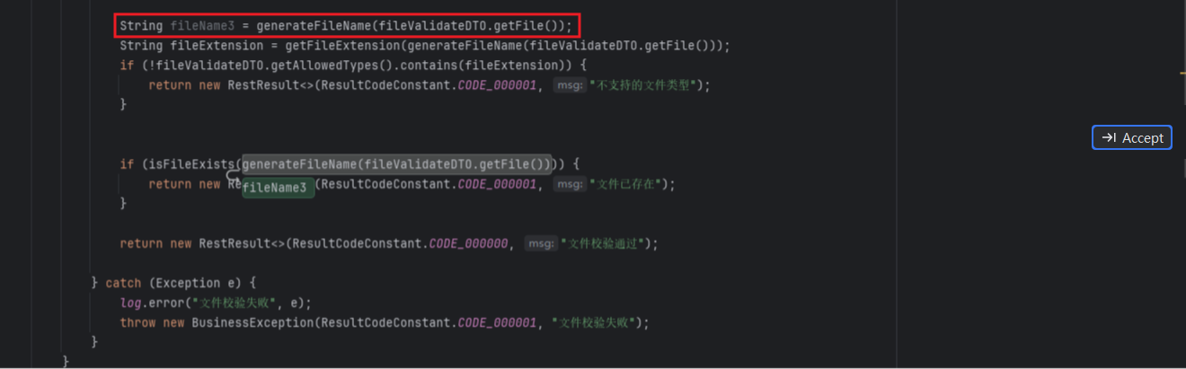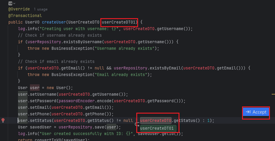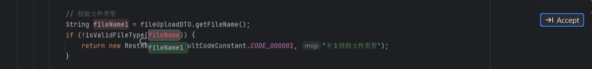 - After renaming a parameter in the current context, trigger inline suggestion prediction with the shortcut. The system analyzes the context and suggests updating all related references to the new name.