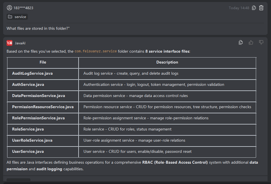 You can directly select a folder and then input your requirements. Feisuo JavaAI will analyze all files within that folder and generate appropriate suggestions or complete the requested task based on both the folder contents and your specified needs.