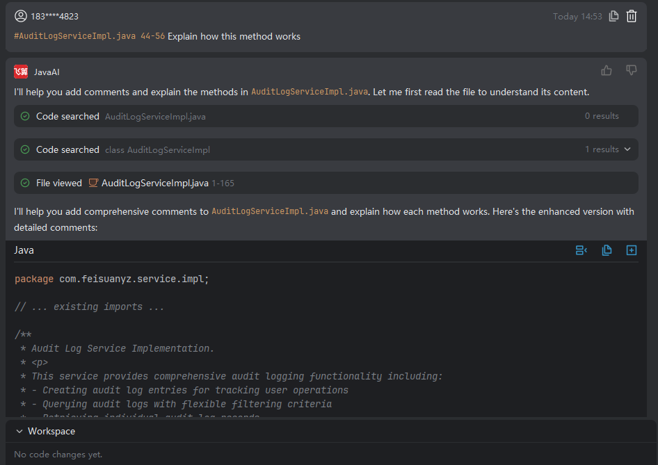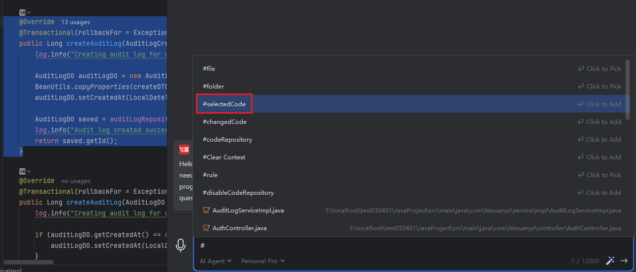 You can select a specific code segment in the code editor and request enhancements such as adding exception handling or other optimizations. The system will apply improvements strictly to the selected code block based on your instructions. Note that this optimization is confined to the highlighted portion and will not affect other parts of the codebase. If the modified code introduces conflicts with other parts of the project, you’ll need to resolve them manually.