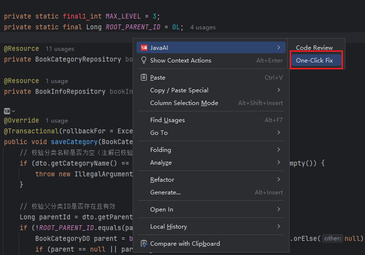 When your project fails to compile, you can select a specific failing file from the compilation output. The intelligent conversation system will then attempt to automatically fix the issues based on the currently selected agent mode (e.g., if Java Chat is active, it will use Java-specific knowledge to propose fixes).