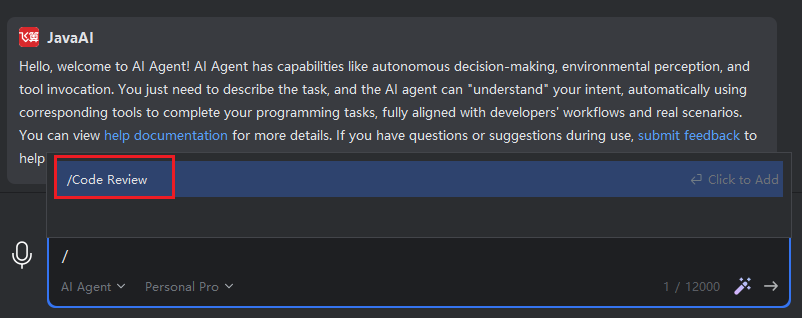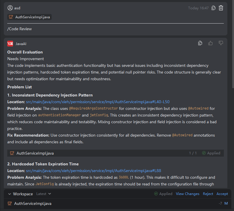 Note: The code review response is generated based on the currently selected intelligent agent mode (e.g., Java Chat). If you expect in-place modifications to the original file, ensure an appropriate agent mode (such as editing-focused) is active.