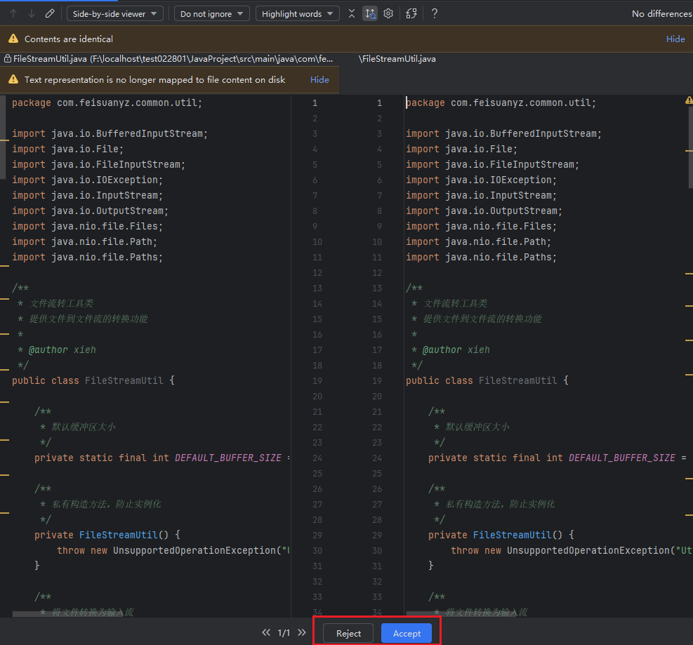 ⚠️ Caution: If files in the current workspace are interdependent (e.g., one class references another being modified), accepting only a subset may lead to compilation errors or runtime issues. In such cases, manual adjustments to related files may be necessary to maintain project integrity and consistency.