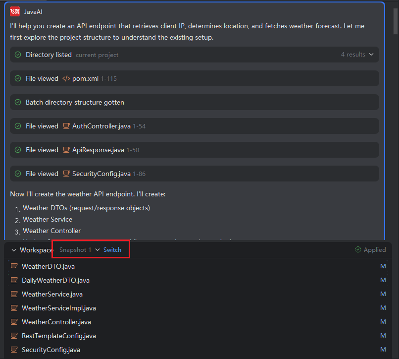 To review or revert to an earlier state of your code changes, you can use the snapshot history feature. By clicking the dropdown arrow, you can view all code change snapshots generated during the current task. Selecting a snapshot allows you to inspect its associated files and, if needed, switch back to that version for further iteration.