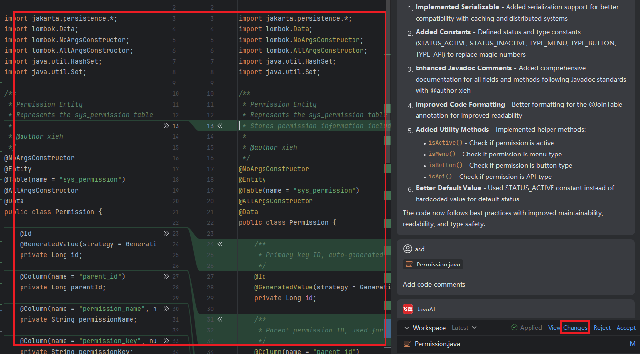 In the workspace, all modified or newly added code content is clearly displayed. You can review these changes and inspect the exact differences in the side-by-side code preview panel on the left. This visual comparison helps you quickly understand and verify every update, ensuring that all modifications align with your expectations.