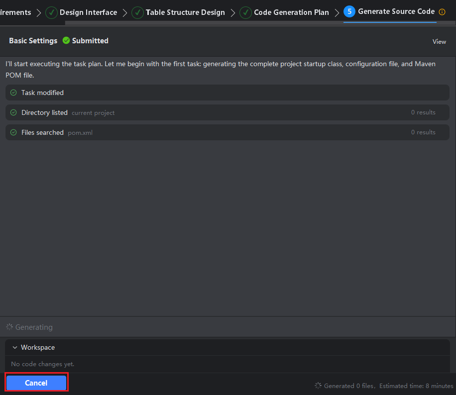 - During Step 5: Generate Source Code, click the Cancel button to abort the task.