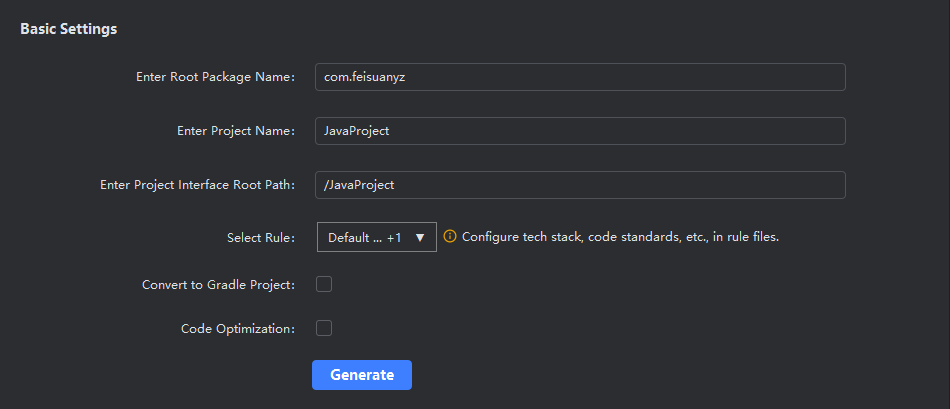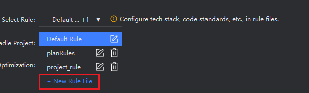 On the source code generation step page when creating a project, you can choose custom rules for generating source code. If none are selected, the default rule file will be used to generate the source code.