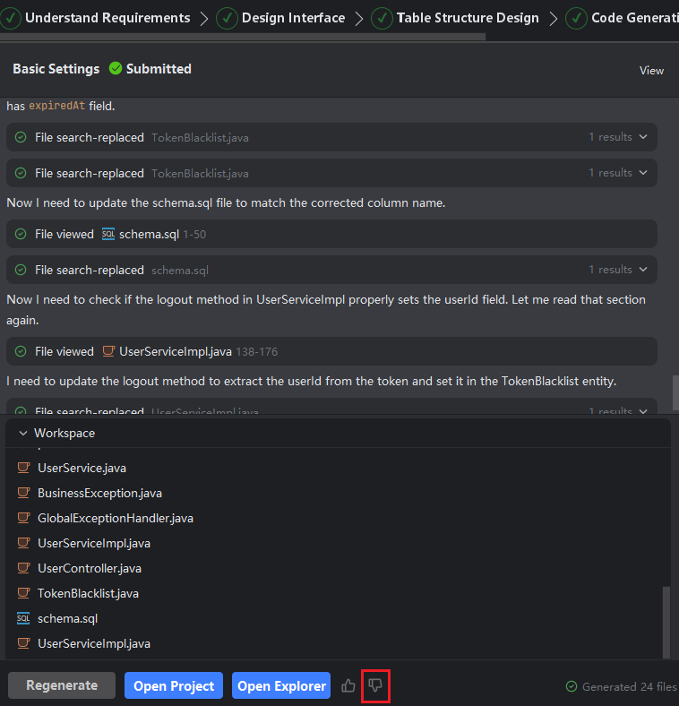 - After the source code is generated, if the source code does not meet your requirements, you can dislike the current source code by clicking the dislike icon, then select the reason.