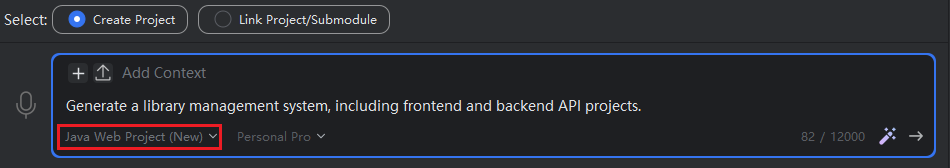 - Select Java Web Project (New Version), then in the input box, clearly describe the frontend requirements and backend requirements, then click Send.