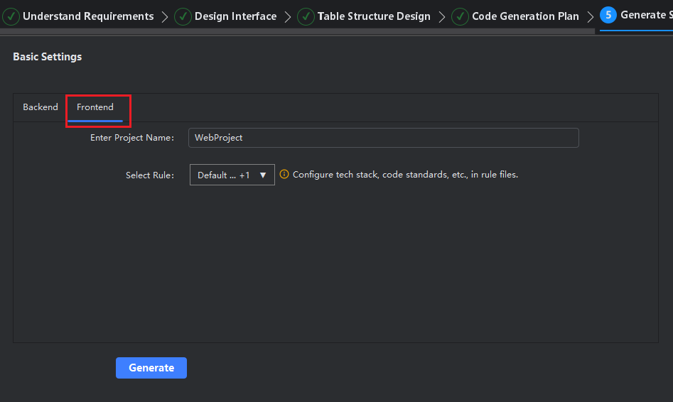 - Step five, after setting up the backend project, click Frontend to set the name and rules for the frontend project.