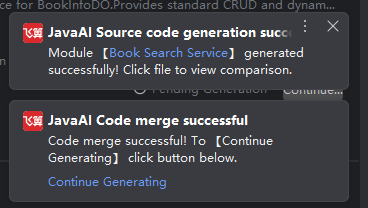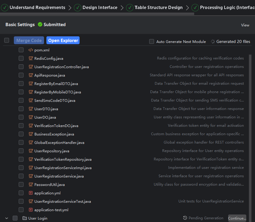Description: Merging project source code is done module by module. After the first module is generated, you can choose which module's source code to generate next based on your needs, and click "Continue Generation" for the corresponding module.