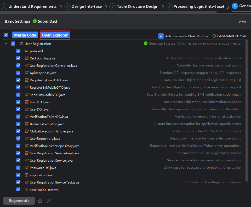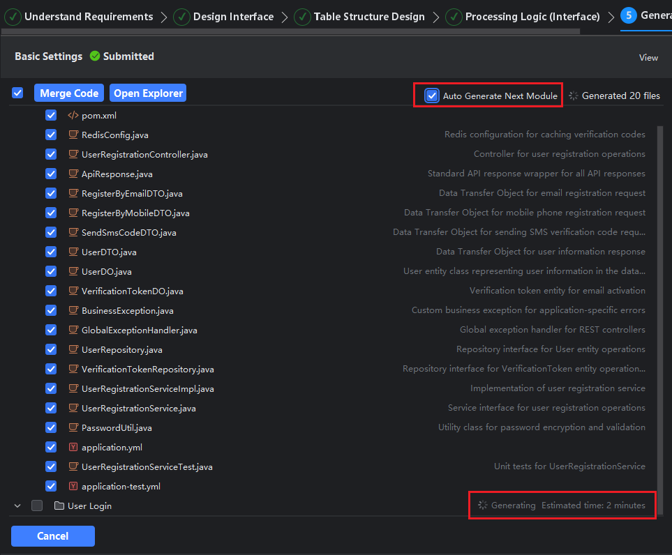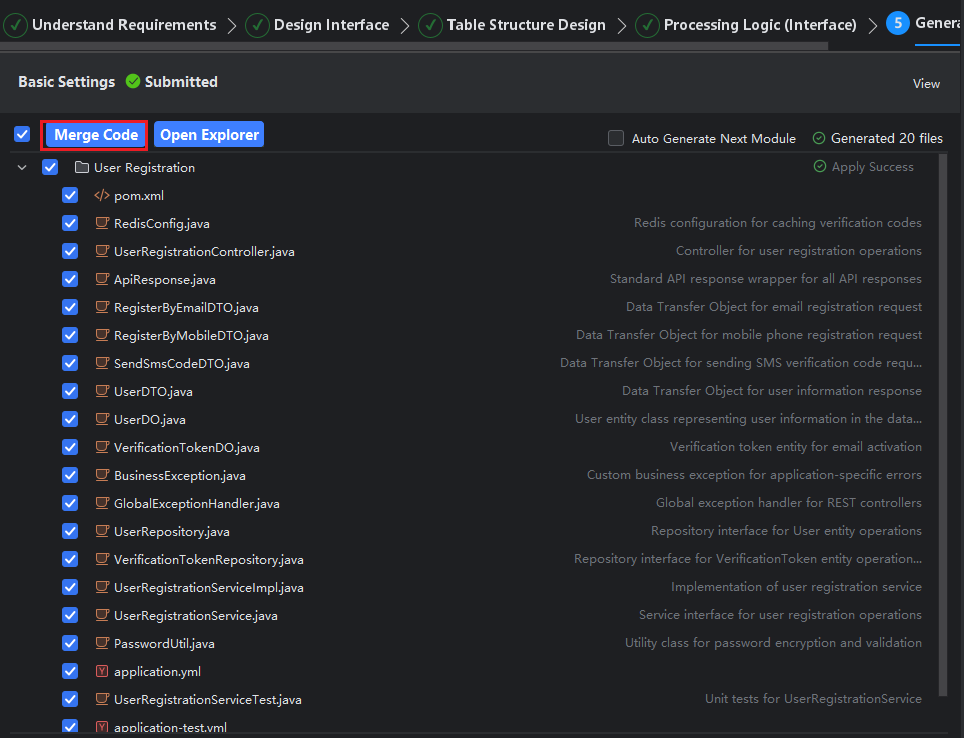 - After module generation is complete, click on the generated Java files to view their content, then check the required files and click "Merge Code".