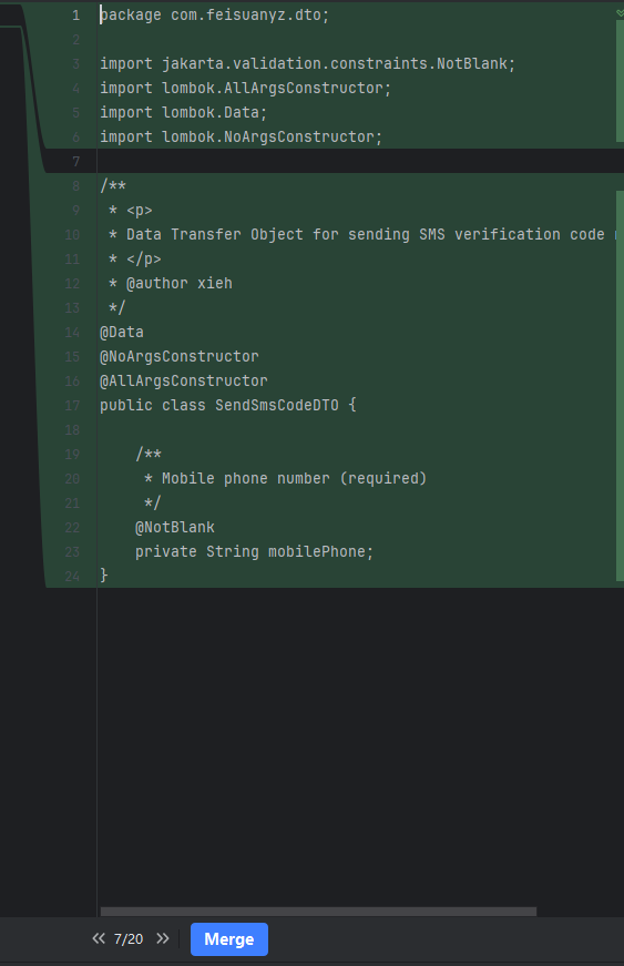 Description: Viewing code files only previews the code content. Since the required jar packages are not loaded, if code appears highlighted in red, this is normal. After selecting files and merging code, there will be no red highlighting. The left side shows existing code, while the right side shows new code, with the comparison result between the two. If the original project does not have this Java file, the left side will be empty.