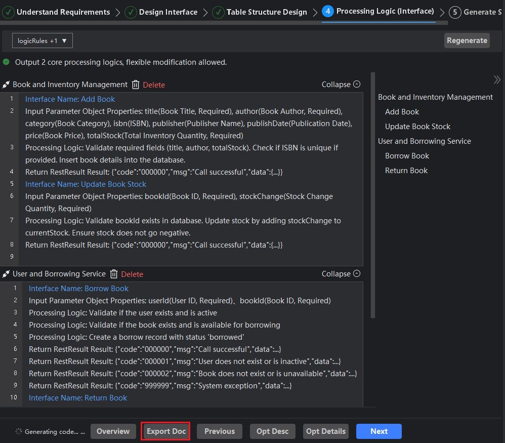 You can quickly export all content generated during the code creation process to a Word document for easy viewing in document format later. The export option is only available after completing the processing logic (interface), and you can also choose to export documentation when viewing the overview. This approach ensures the completeness and accuracy of the documentation, facilitating your further use and reference.