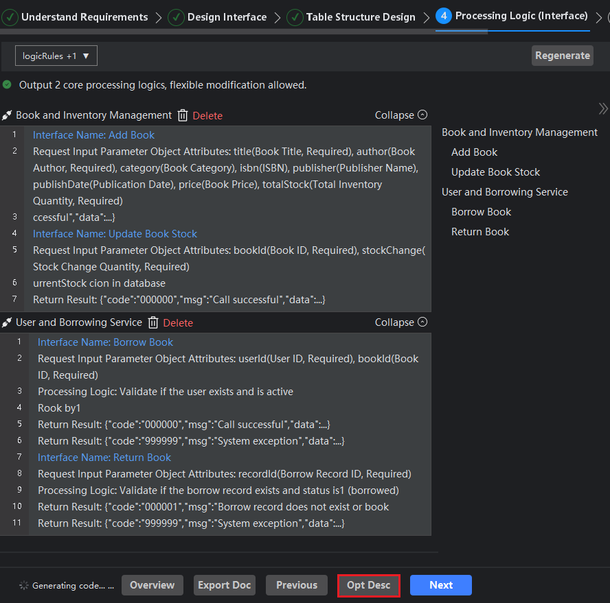 Optimizing description refers to the process where, after modifying the interface processing logic, the system will organize and polish the updated requirements to ensure the context of the processing logic is smooth and clear. Ultimately, the system will regenerate the source code project based on the optimized requirements.