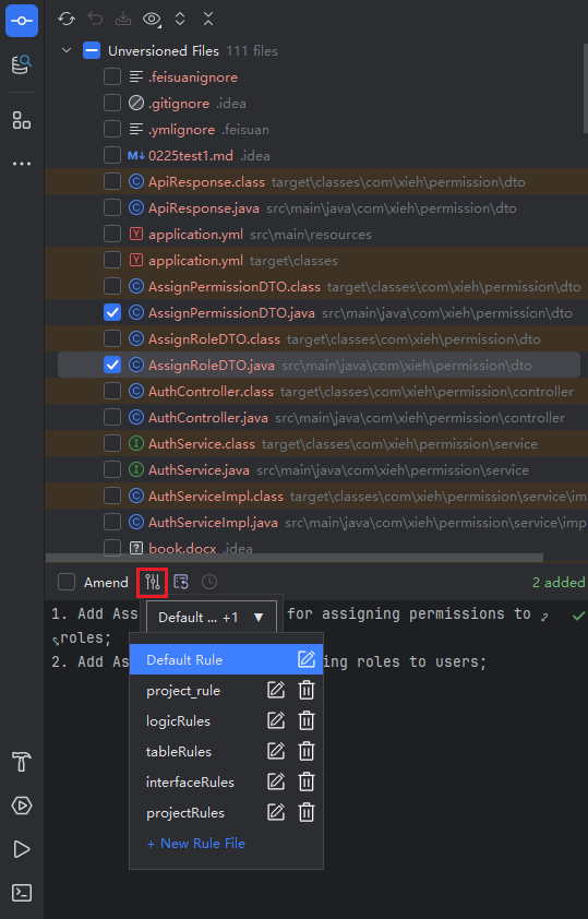 - In the git pending commit list, select the files to commit, then click the "Generate Git Commit Message" icon.