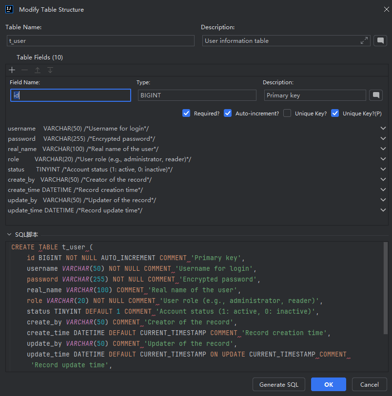 - Fields can be added, deleted, or modified as needed. After modification, click the "Generate SQL" button to get the latest SQL statement.