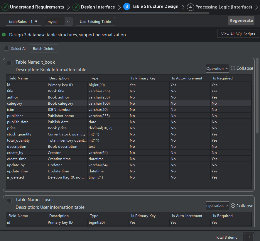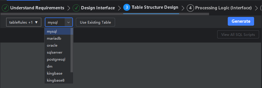 - Next step: If your interface logic does not require database fields, you can select Next to skip table structure design.