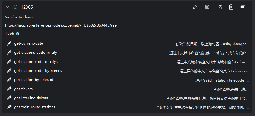 SSE type (remote service hosting): This type of service is hosted on a remote server, with a simple and quick configuration process, making it ideal for new users to get started quickly. In this example, we will use the 12306 ticket inquiry system's MCP service selected from the ModelScope MCP Marketplace to experience invoking this MCP tool within an agent to query ticket information.