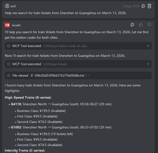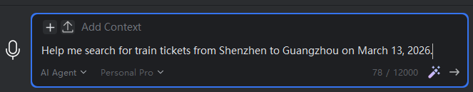 - In Smart Agent chat mode, enter the request: Query railway ticket information for travel from Shenzhen to Shanghai on October 25, 2025.