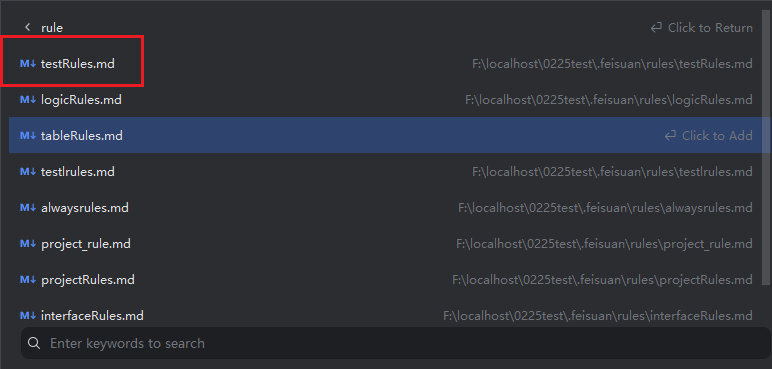 - In the rule list, click the rule entry. The Markdown file opens in the editor. Close the preview and directly edit the rule content, then save.