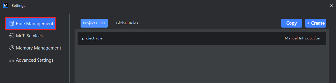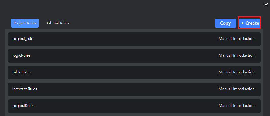 - Click the "Rule Management" icon in the top-right corner, select a rule scope (project or global), then click "Create".