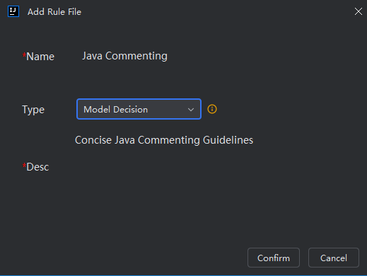 - Enter a rule name, select "Model Decision" as the type, and provide a clear, detailed description of the rule’s purpose and content. Then click "OK".