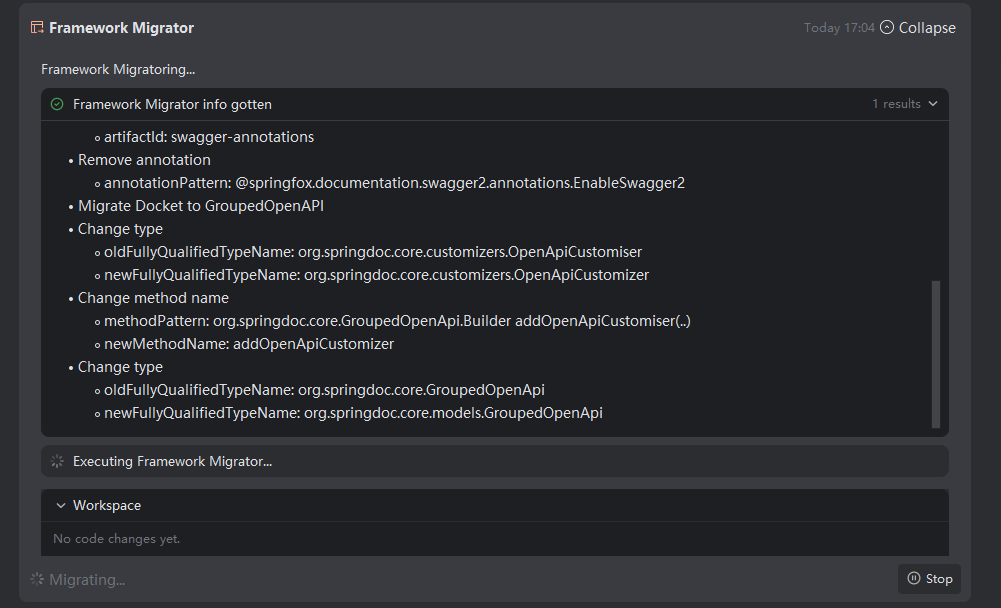 The Framework Migrator is dedicated to helping developers migrate code from one framework to another—for example, from Log4j—automatically handling API changes, syntax adjustments, dependency upgrades, and other issues, significantly reducing migration costs.