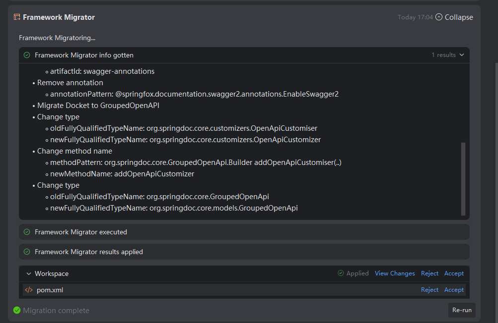 - After migration is complete, review the modified files and choose "Accept" or "Reject".
