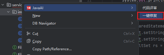当项目工程中多个文件出现错误时,您可以批量选择这些有问题的文件,然后使用Java Chat的批量修复功能尝试自动修复。请注意,自动修复可能无法达到100%的精准度,在某些情况下,您可能仍需手动检查和调整修复结果。