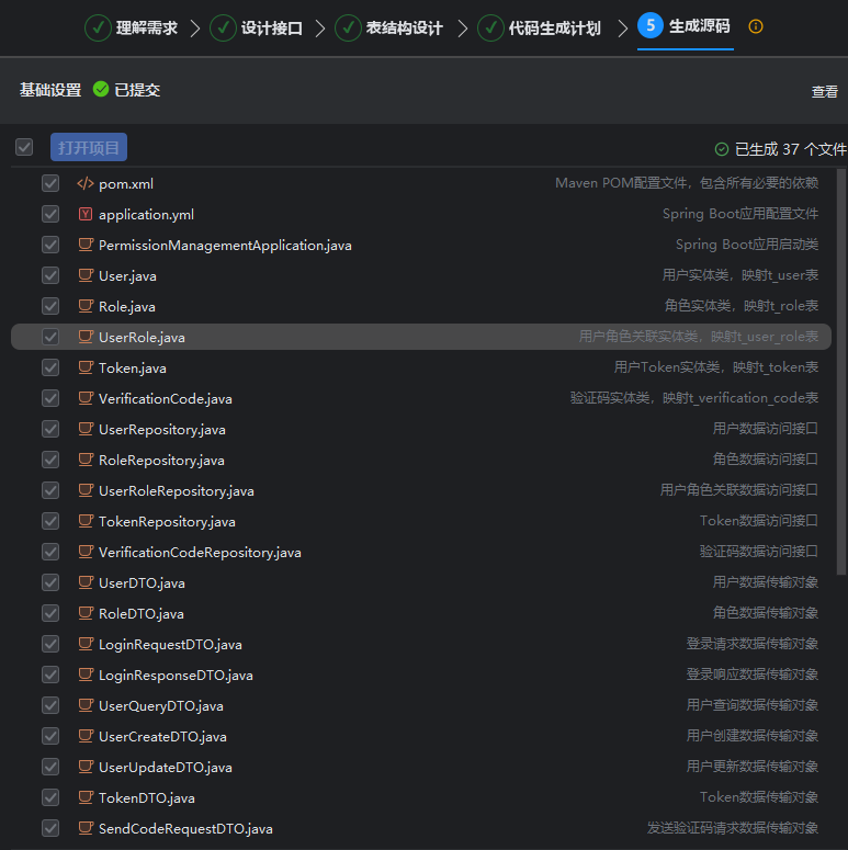 - 步骤五:直接生成对应的文件源码,包含所有计划的功能。等待所有文件生成后,方可选择文件,然后打开项目。