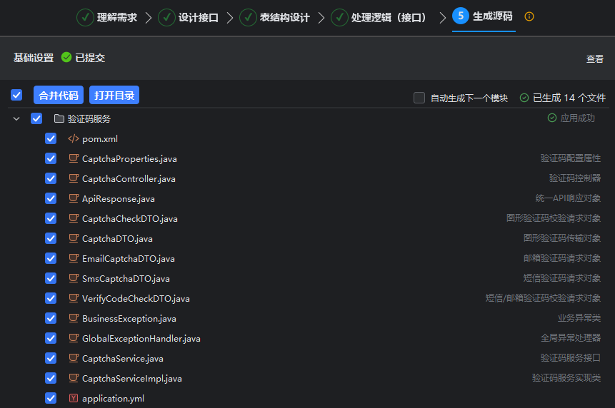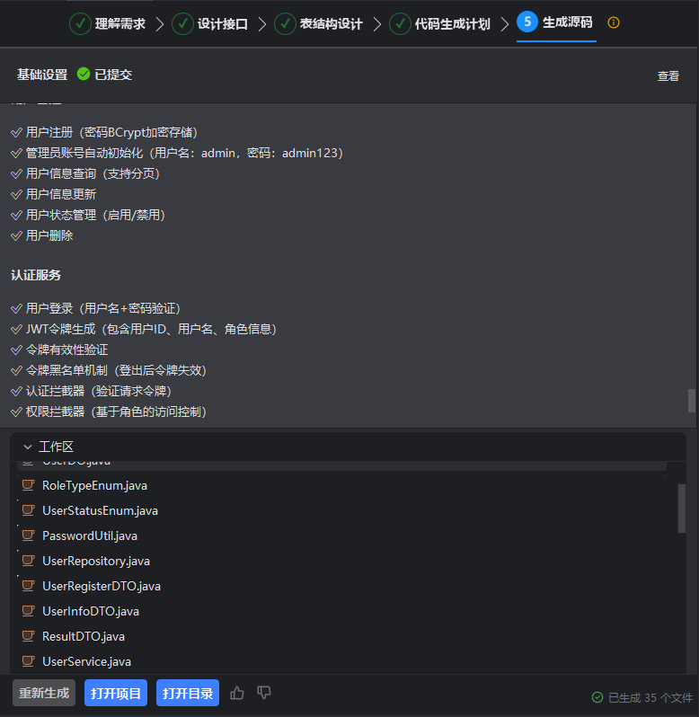 - 步骤五:直接生成完整的源码文件,不再基于模块划分。若有前端的需求,则会根据需求生成前端相关的代码文件。