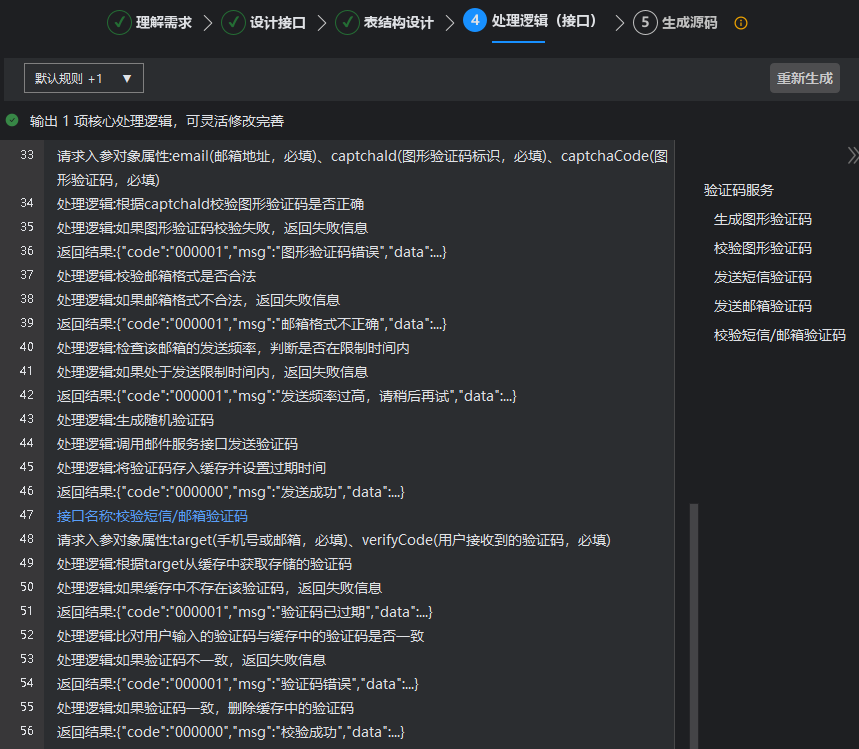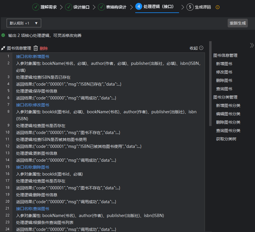 - 步骤四:根据预设模块,逐一生成对应接口,并直接展示各接口的实现逻辑。