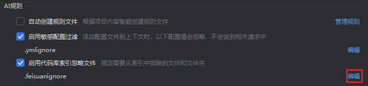 在代码库索引搜索时,可自定义忽略的文件,被忽略的文件则不会被检索到。若当前项目已经智能分析完成,则设置了忽略的文件不会生效,只对新增的文件生效。