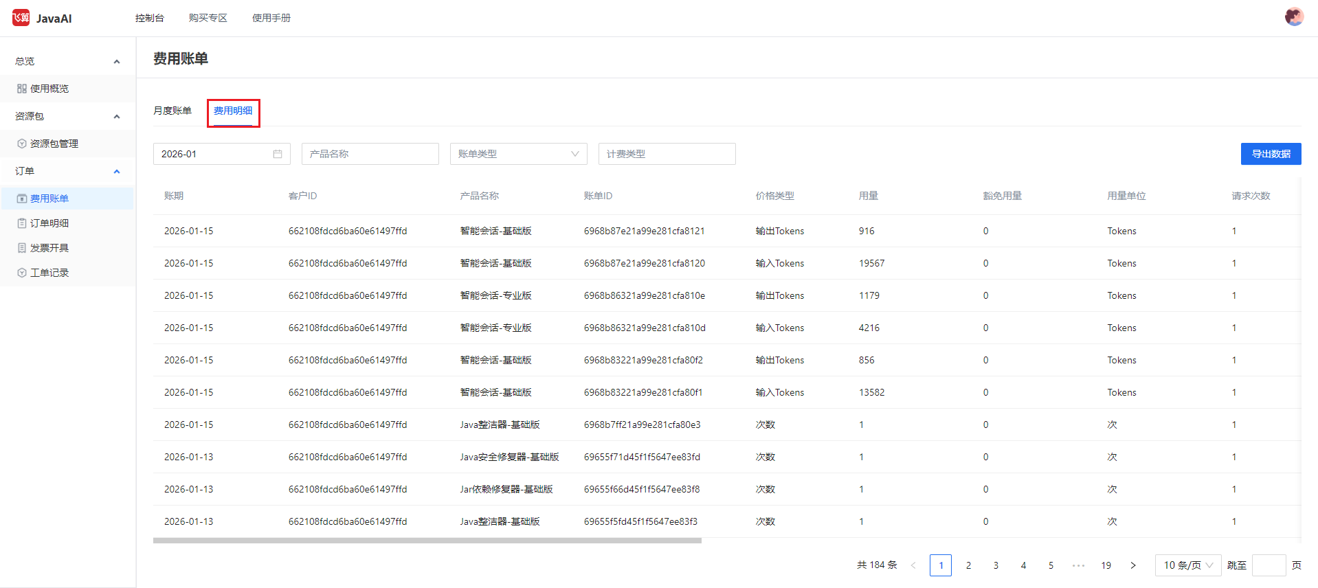 答:打开官网https://feisuanyz.com,进入控制台,选择“订单 > 费用账单 > 费用明细” ,可以查看到资源包具体消耗的详情。
