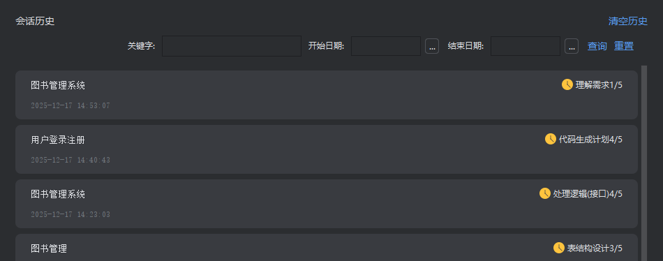 会话历史记录将保存曾经生成过的源码,您可以通过查看历史记录来获取原始需求、任务当前的节点等相关信息。这样可以帮助您追踪每次生成的任务详情和进展。