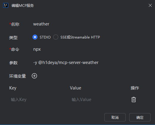 说明:类型请根据对应服务信息选择,STDIO需要填写参数,SSE或Streamable HTTP则需要填写对应的地址。这些基本信息可在MCP市场官网中的对应MCP服务中查看。