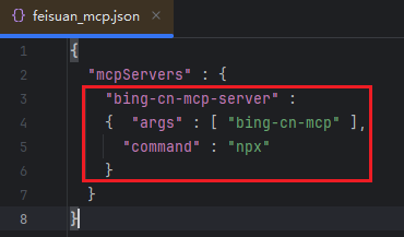 - 在代码编辑器区已打开配置文件,在配置文件后面填写对应MCP的配置信息,然后保存配置文件。